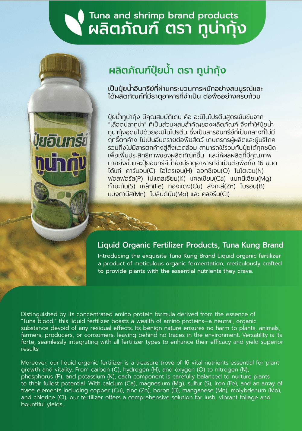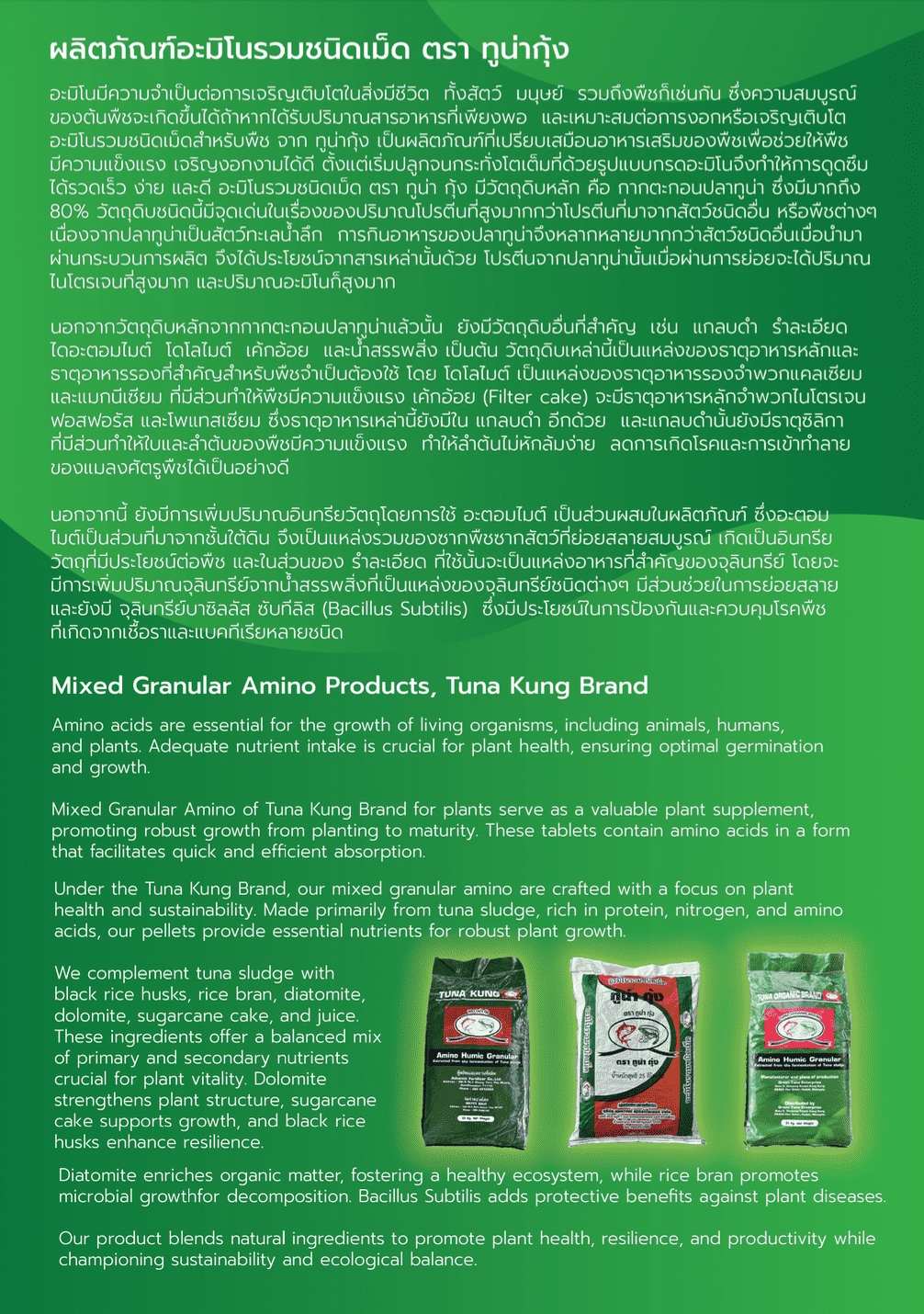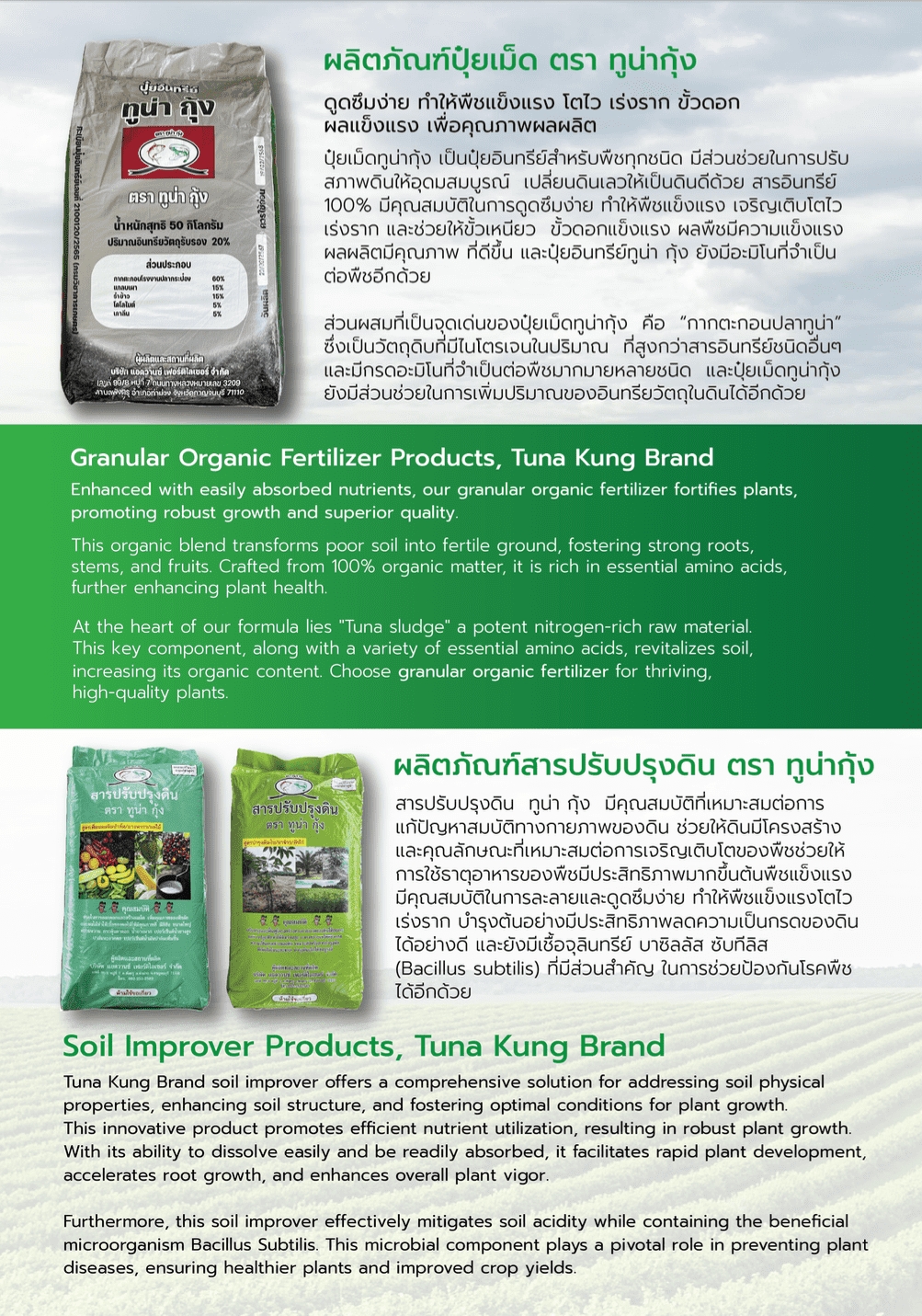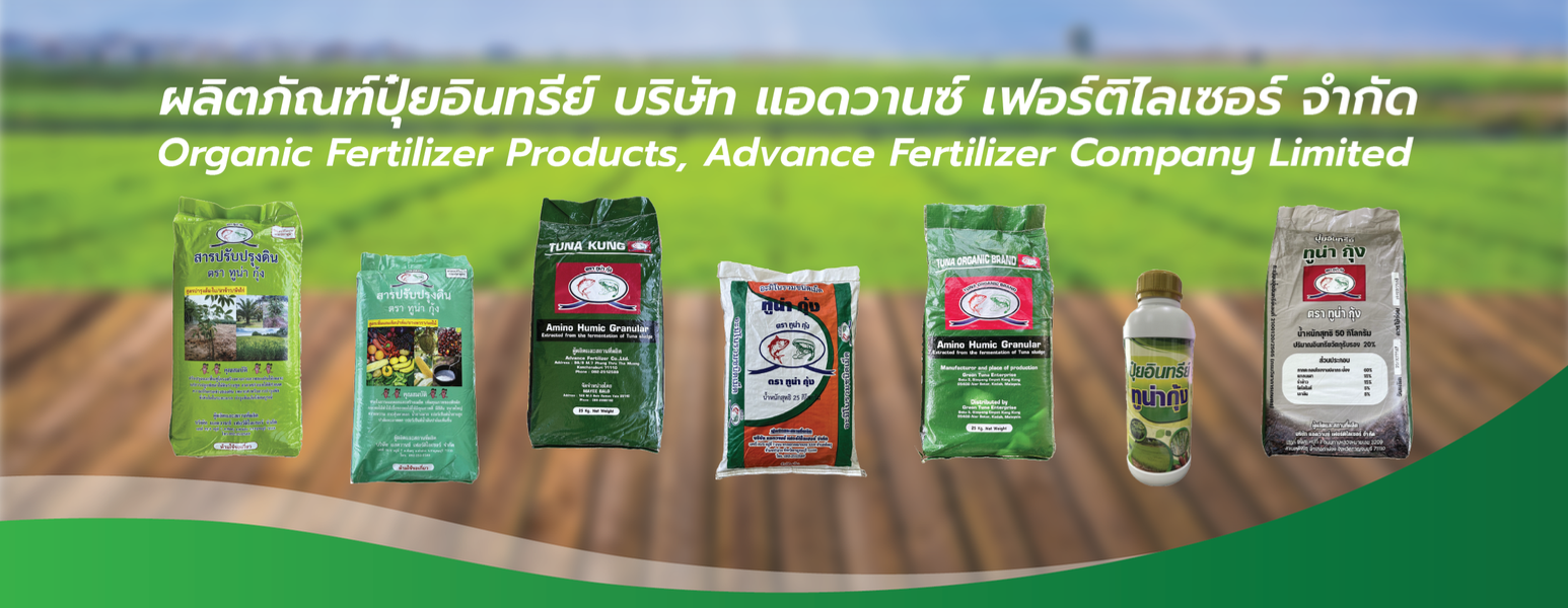 Organic fertilizer products of Advance Fertilizer Company Limited are all 4 products: Liquid organic fertilizer Tuna Kung Brand, Granular organic fertilizer Tuna Kung Brand, Soil improver Tuna Kung Brand and Mixed granular amino Tuna Kung Brand. The company’s aim in producing Inorganic fertilizer means there is a need to enter organic fertilizer products into the organic agricultural market and is An alternative for farmers who produce in chemical farming systems to turn to using more organic fertilizers. which product The company’s products are the answer for farmers in every system. The main ingredients that are featuredof the products are“Tuna sludge” and“Tuna blood” which are raw materials containing nitrogen. In higher quantities than other types of organic substances and contains amino acids that are essential to plants by plant roots Can absorb nutrients directly Promote the growth of roots and leaves to sprout.Stretches the stems, accelerates flowering and fruiting, resulting in better yields. perfect quality Observable from the leaves It has bright green color, strong stems, beautiful colorful flowers and fruits. And most importantly, it is safe.There is no danger to consumers.